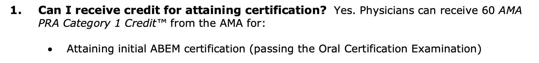 Generally, Category 1 credits are formal education. The highest level of credit that you'll see advertised by conferences, for instance, is American Medical Association Physician’s Recognition Award Category 1 Credit. Phew. That's a mouthful. Often you'll see AMA PRA Category 1 for short.