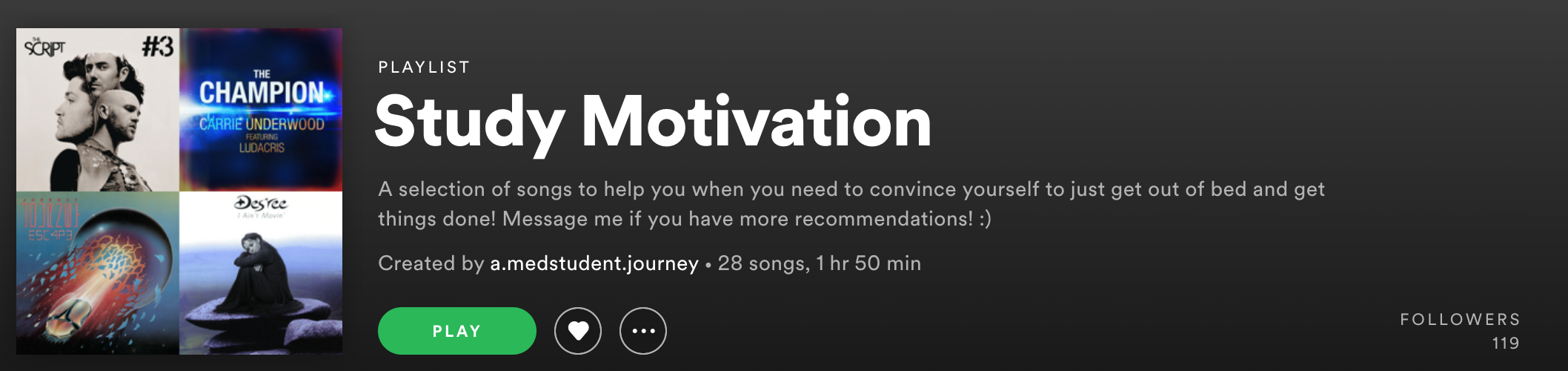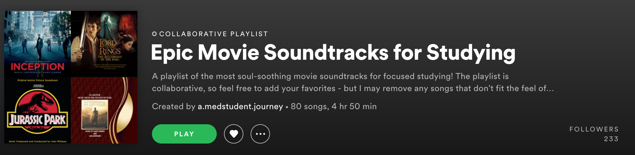 I generally play instrumental/classical music without words. I have a few set “study music” playlists on Spotify that I turn to when I’m feeling drowsy but have already had my breaks. I find ‘epic’ movie soundtracks especially stimulating, and they can jerk me back into focus mode.