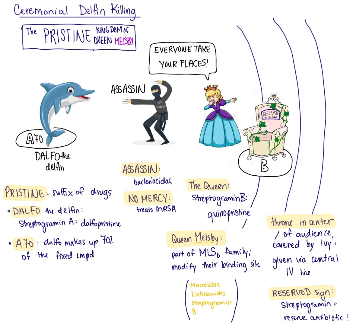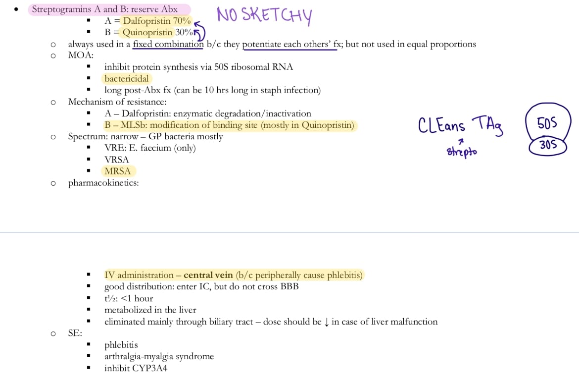 Note: Streptogramin has a NARROW spectrum, targeting most Gram positive microbes. It treats MRSA (no mercy) but also VRE (I just didn’t have a way to incorporate it).